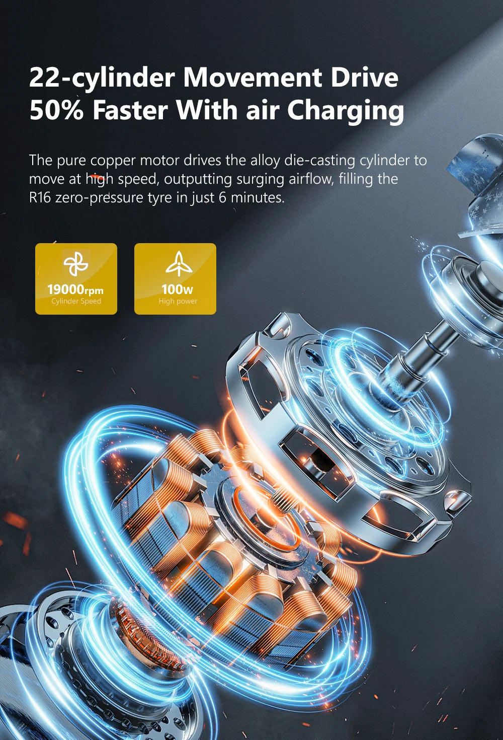- Powerful 22mm Cylinder Motor: 50% faster inflation than standard models – fills an R16 tire from zero pressure in just 6 minutes with 30L/min airflow