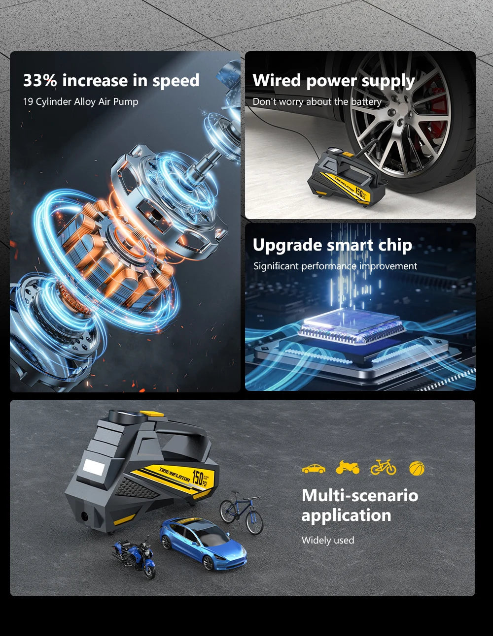 - High Pressure Capability: Delivers up to 150 PSI for versatile inflation needs across all vehicle types