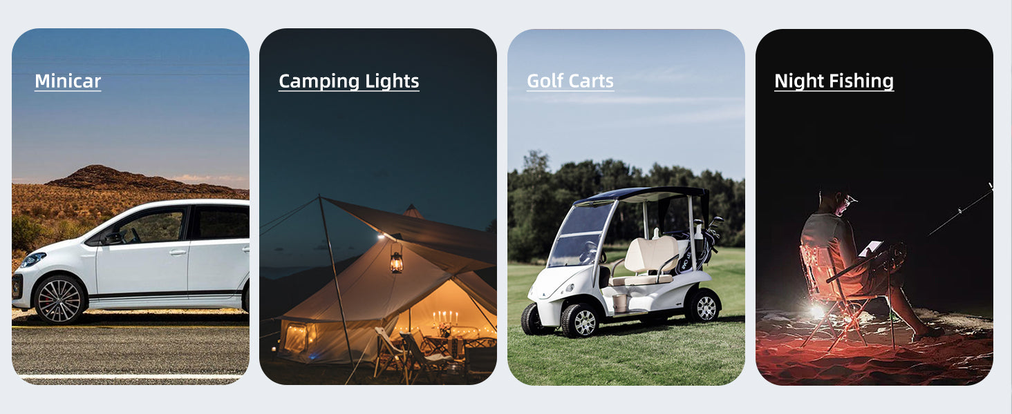 Wide Application: The car battery charger jump starter has a wide range of applications, making it suitable for mini cars, golf carts, camping lights, lawn mowers, preparing fishing boats for water and night fishing, and providing power for outdoor activities